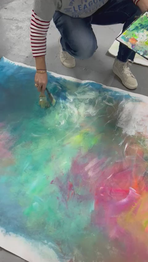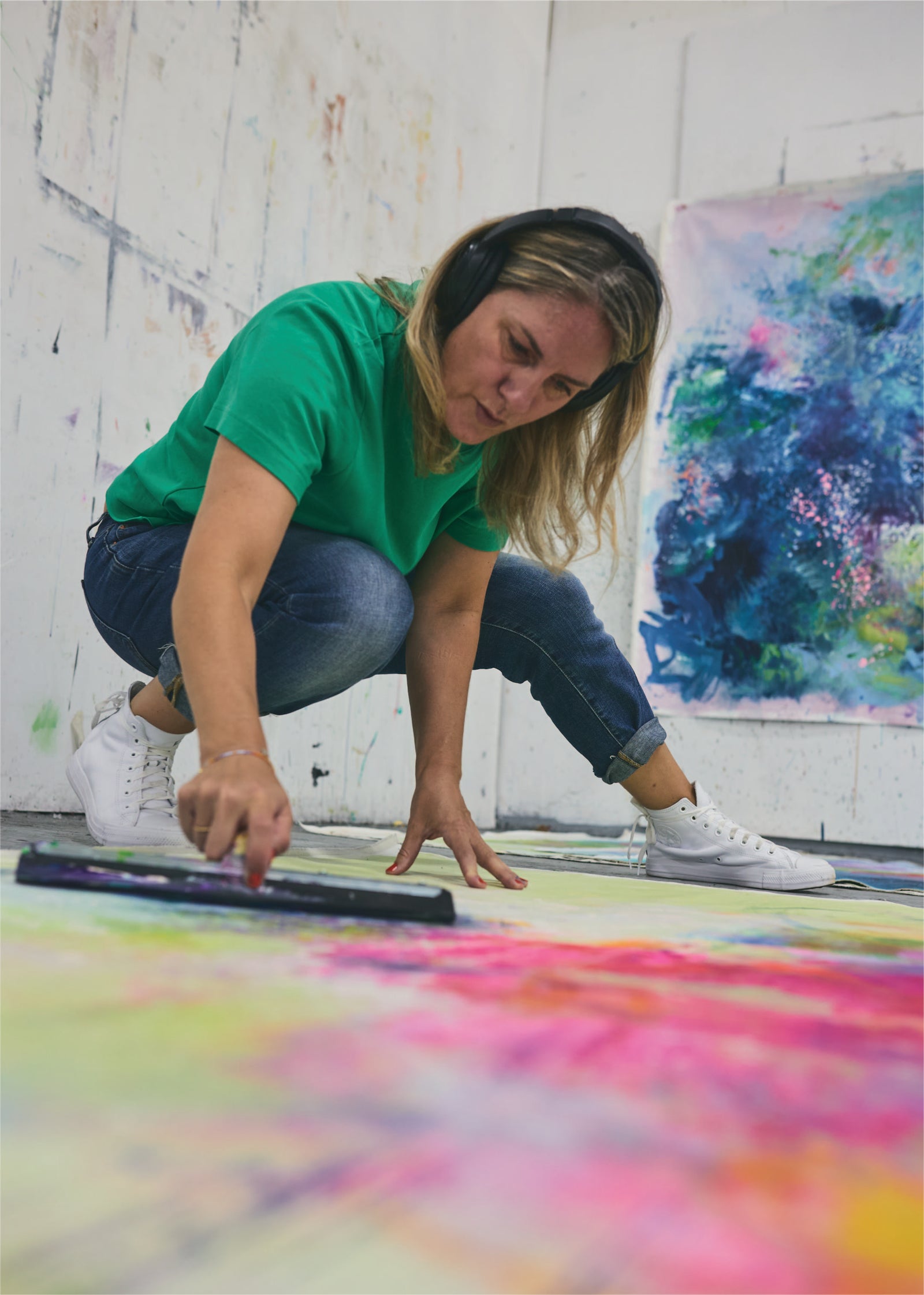 Painting to me is a beautiful and treacherous journey of deep discovery into myself . The “layering” in my work is the constant adjustment of each mark, hand or brush stroke, pour of paint, spray of color previously made directing me to my next move. I often feel as though I am a conduit for something much larger than myself.