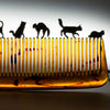 The golden amber comb glows under carefully controlled light, while the silhouetted cats create a striking rhythm of movement and personality. With its clever juxtaposition of scale and subject, the piece evokes themes of curiosity, independence, and the fine line between order and chaos. It is a delightful conversation starter, blending surrealism with a touch of wit, perfect for collectors who appreciate artwork that makes the ordinary extraordinary.