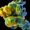 This image showcases a mesmerizing swirl of colorful smoke or ink suspended in liquid, captured against a black background. The composition features flowing, cloud-like plumes in shades of teal, turquoise, and hints of white, blending seamlessly with each other to create an ethereal, almost nebula-like effect. The soft, smooth textures and delicate tendrils of the smoke give it a dynamic and fluid appearance, while tiny white specks scattered throughout add a sense of depth and dimension. The overall aesthetic is abstract and otherworldly, evoking a sense of motion and transformation.