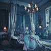 With her unapologetic gaze, the model seems to dare us to enter her fairytale world of impossible heights. Everything stretches upward, from the grand four-poster bed and the precarious house of oversized cards to the gravity-defying wig and sky-high heels. Nothing was digitally added—what you see was all shot in the Tapestry Room of Belvoir Castle, England.