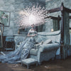 Slightly distant, a young woman gazes just past us from her coolly elegant boudoir. A luminous crown of plumage shines bright above the raw beauty of ripped silk and the free-flowing tulle from her gown. She looks at home amongst her lavish, patterned surroundings. Miss Aniela photographed this piece at a French chateau as part of her bestselling Surreal Fashion series.