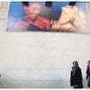 Captured in New York. A guy holds his hands in prayer as he stares up at a bill board of two women, while walking with his two female friends.