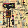 This artwork features a whimsical, abstract robot figure at the center, drawn in a colorful and geometric style. The robot has a rectangular head with round eyes—one yellow and one blue—and a toothy yellow smile. Its body and limbs are composed of various mechanical and electronic components, including wires, circuits, and dials.