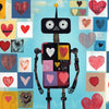 The robot’s arms and legs are segmented and mechanical, giving it a retro, handmade appearance. The background is a collage of squares and rectangles in various colors, each containing a unique heart design — some simple and solid, others textured, painted, or abstract.