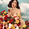 The Housewife presents a striking vision of femininity layered with irony and allure. Set against a painted sky backdrop, the figure reclines amid a cascade of roses, her glamorous poise interrupted by a cigarette and the flicker of flame. The work explores the tension between beauty and rebellion, domesticity and defiance, blending cinematic drama with symbolic undertones of desire, confinement, and resistance.