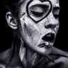 Woman I is a striking black-and-white portrait that explores vulnerability, defiance, and self-expression through raw contrasts of light and shadow. The face, painted with bold strokes and marked by a heart framing the eye, merges human intimacy with symbolic abstraction. Every detail, from the textures of the skin to the deliberate imperfections of the paint, captures a sense of intensity that lingers in the viewer’s mind.